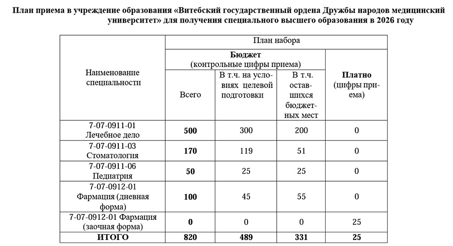 Интересно, что платные места сохранились в Витебском медуниверситете, но только для заочников на специальность «фармация» (для 25 абитуриентов). Вуз уже опубликовал план приема на 2026 год.